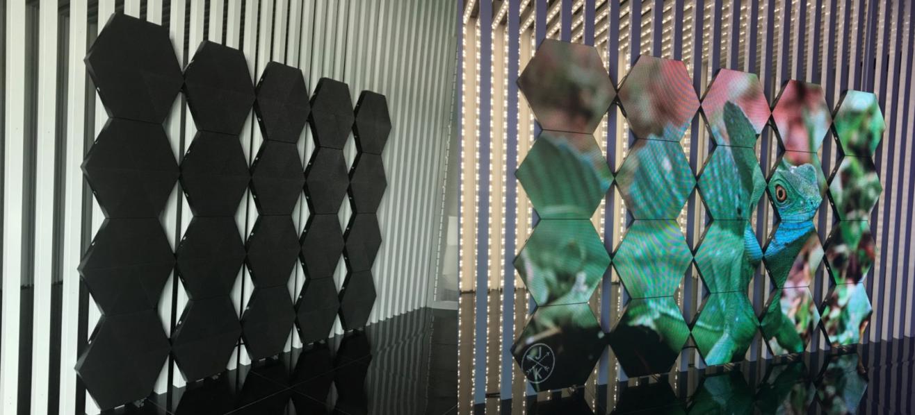 (由三角形拼成的六邊形屏-左沒點亮/右點亮)